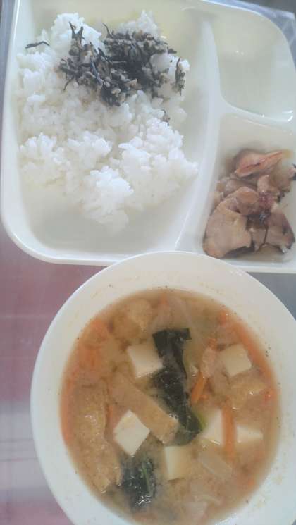 今日の給食は、鶏肉の甘辛焼き、みそ汁、魚ひじきそぼろ、ごはん🍚、牛乳🥛です。