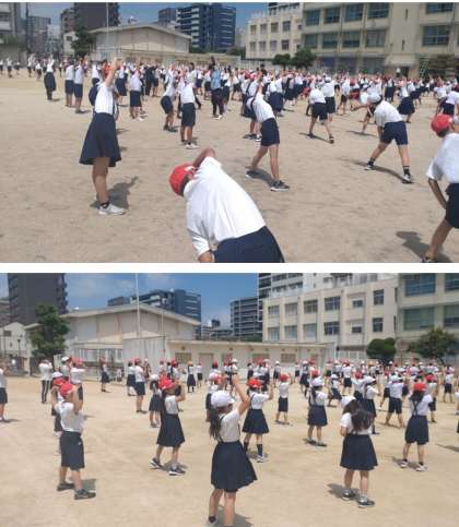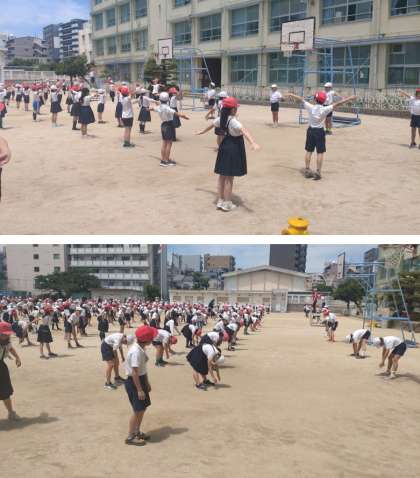 今日もラジオ体操がありました。快晴の青空の下、どの学年の子どもたちも大きな動きを意識しながらラジオ体操に取り組んでいました。