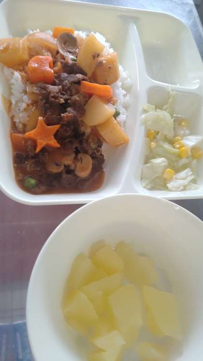 今日の給食は、ハヤシライス、キャベツとコーン🌽のサラダ、りんご🍎(カット缶)、牛乳🥛です。