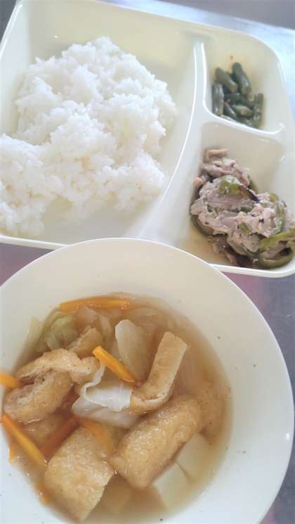 今日の給食は、豚肉🐖の梅風味焼き、五目汁、さんどまめのごまあえ、ごはん🍚、牛乳🥛です。
