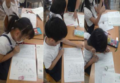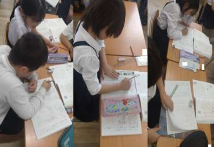 3年生が国語で単元『「わたし」の説明文を書こう』の学習に取り組んでいます。この学習では、伝えたいことの中心を明らかにして説明文を書いていきます。写真は、中心を決めて、文章の組み立てを考え書いている子どもたちの様子です。