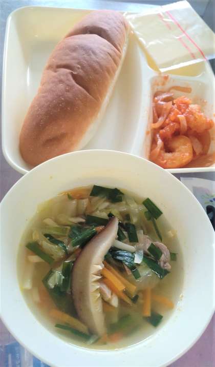 今日の給食は、えび🦐のチリソース、中華スープ、スライスチーズ、コッペパン、ブルーベリージャム、牛乳🥛です。