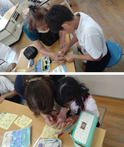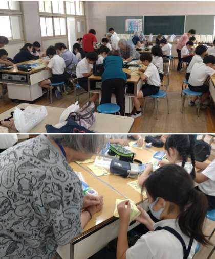 今日の午前中に地域の老人会の方々に来ていただき5年生と世代間交流が行われました。家庭科の裁縫の玉結びや玉止め、各種の縫い方などを教えていただきました。子どもたちは老人会の方々に優しく教えてもらいながら裁縫を熱心取り組んでいました。