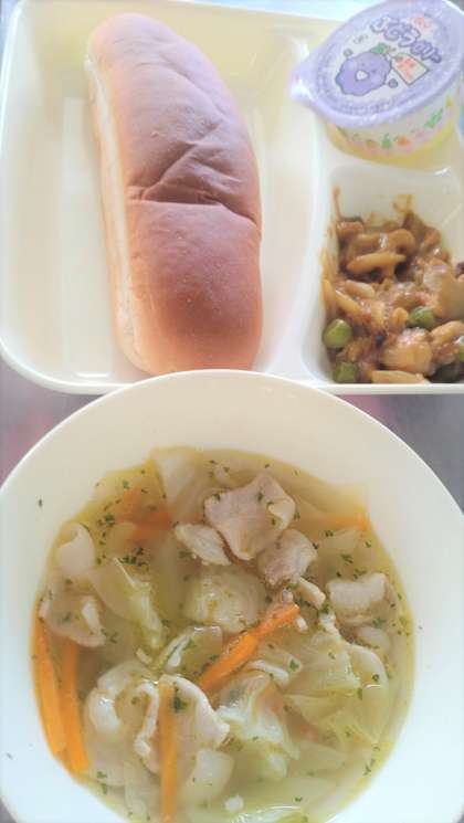 今日の給食は、カレーマカロニグラタン、てぼ豆のスープ、ぶどう🍇ゼリー、黒糖パン、牛乳🥛です。
