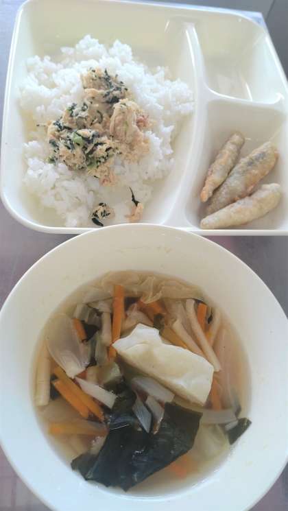 今日の給食は、いわしのてんぷら、五目汁、とりなっ葉いため、ごはん、牛乳🥛です。