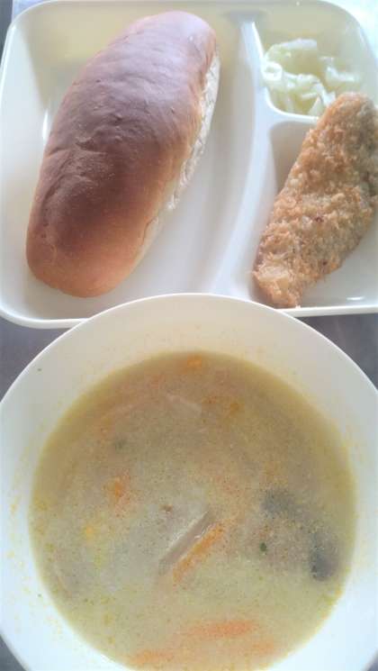 今日の給食は、サーモンフライ、豆乳スープ、キャベツのゆずドレッシング、黒糖パン、牛乳🥛です。