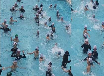 本日、2、3限目に2年生のプール開きがありました。低学年のプール水泳は、「水遊び」の領域で、「水の中を移動する」「もぐる・浮く」などの基本的な動きを楽しみながら運動に取り組みます。写真は、音楽に合わせてリズミカルに楽しく水慣れをしている子どもたちの様子です。とても楽しそうです。