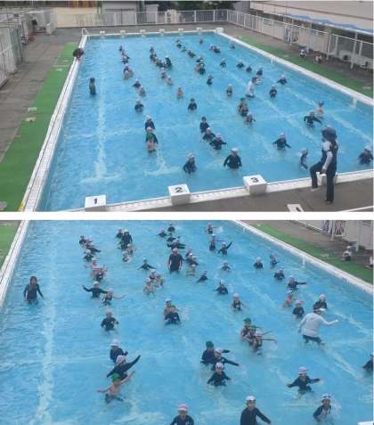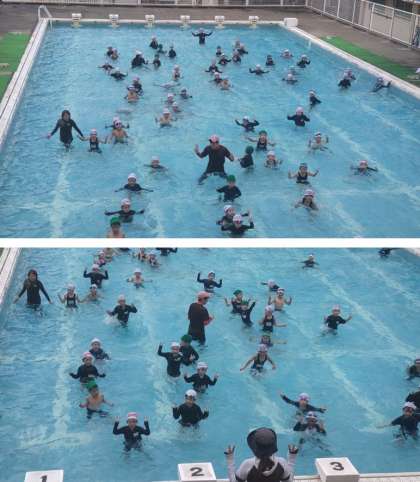 今日の2、3限目に1年生のプール開きがありました。小学校でのはじめてのプールでした。準備運動の後、子どもたちは、音楽に合わせて水慣れのダンスをしました。1年生の「水遊び」の学習では、導入として「水の中を移動する運動遊び」と「もぐる・浮く運動遊び」を行って、基本的な水中での動きを身に付けます。