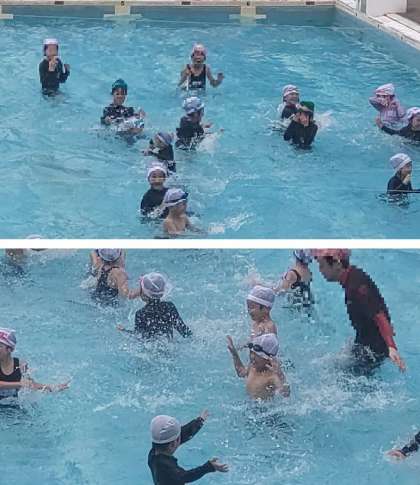 写真は、楽しく水遊びの運動をする子どもたちの様子です。
