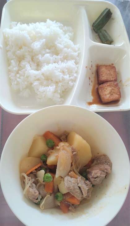 今日の給食は、みそ肉じゃが🥔、あつあげのしょうがじょうゆかけ、オクラのおかかいため、ごはん🍚、牛乳🥛です。