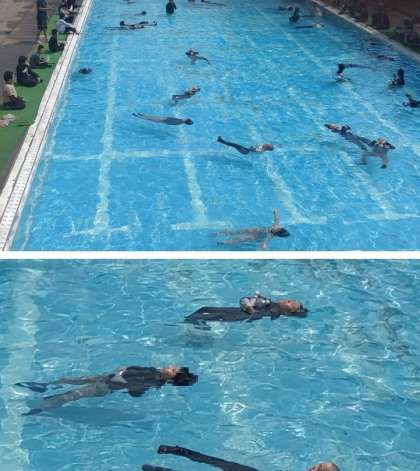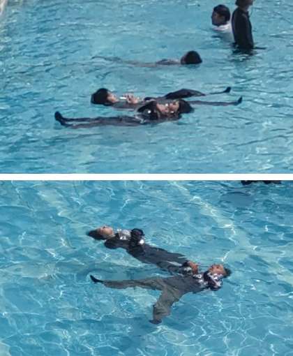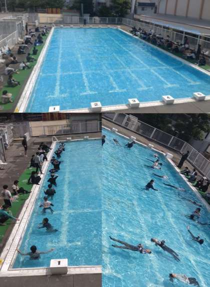 6年生が5限目に「着衣泳」の学習に取り組みました。「着衣泳」は、衣服を着たまま入水し、水難事故から身を守るための学習です。服を着ていると、水中でどれだけ動きにくくなるかを体験し、仰向けで浮いて、ペットボトルを使いながら、浮く工夫に取り組みました。