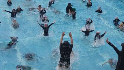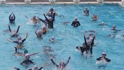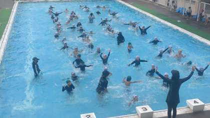 6年生に続いて2限目は、2年生のプール水泳です。写真は、楽しく水なれをしている様子です。