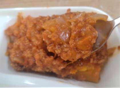 〇綿実油を熱し、にんにくを香りよくいため、牛ひき肉、豚🐖ひき肉をいため、ワインをかける。更にたまねぎ、かぼちゃの順にいため、湯を加えて煮る。