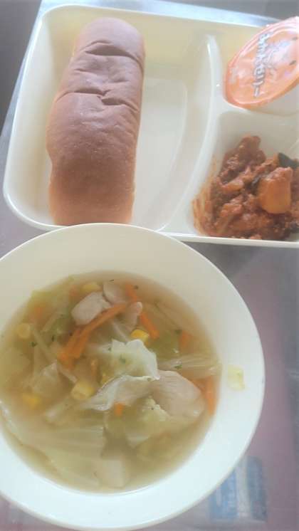 今日の給食は、かぼちゃのミートグラタン、スープ、みかん🍊ゼリー、パン🍞、牛乳🥛です。