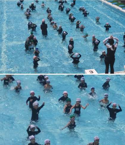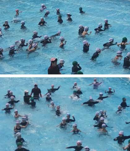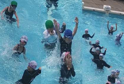 今日の3限目は、1年生のプール水泳でした。子どもたちも大きなプールに少しずつ慣れてきたように思います。安全面に配慮しながら楽しく「水遊び」の運動に取り組めるようにしていきたいと思います。写真は、元気にプールで音楽に合わせて水慣れのダンスを踊る子どもたちの様子です。