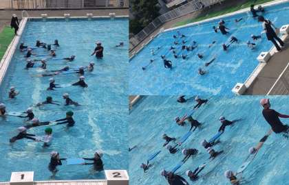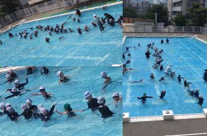 今日の1年生のプール水泳は、みんなで手をつないでくぐる水遊びの運動(上の写真)から、ビート板を使って二人組のバディで、水中を移動する運動(下の写真)に取り組みました。友だちと協力しながら楽しく水遊びの運動をしていました。