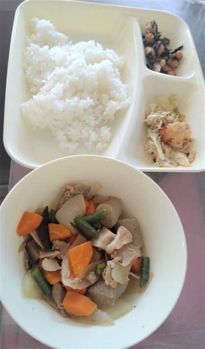 今日の給食は、豚肉🐖と野菜の煮もの、ひじき豆、ささみとキャベツのごまみそ焼き、ごはん🍚、牛乳🥛です。