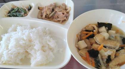 今日の給食は、豚肉🐖のしょうが焼き、五目汁、ツナと野菜のいためもの、ごはん🍚、牛乳🥛です。