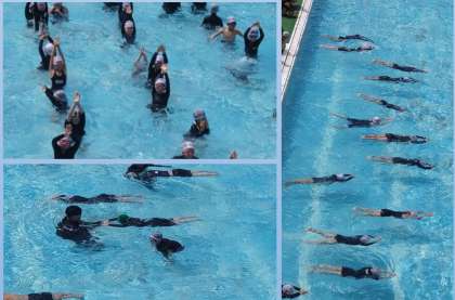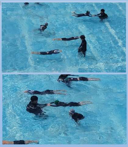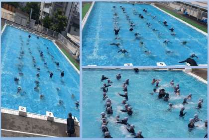 2限目に3年生のプール水泳がありました。音楽に合わせて楽しく「浮いて進む」、「もぐる・浮く」の水泳運動に取り組みました。初歩的な泳ぎの基本となる「けのび」をプールの横を使って練習しました。頭を腕の間にしっかりと沈めて、一直線に身体を伸ばして水面に浮く姿勢になるように学んでいます。