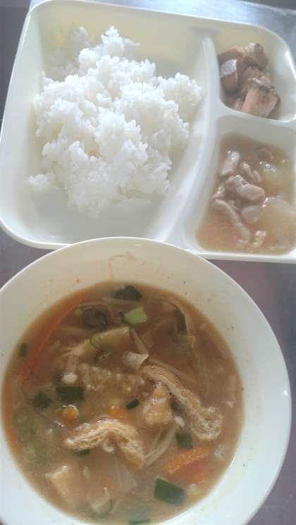 今日の給食は、さけのつけ焼き、みそ汁、とうがんの煮もの、ごはん🍚、牛乳🥛です。