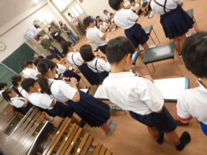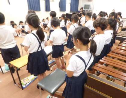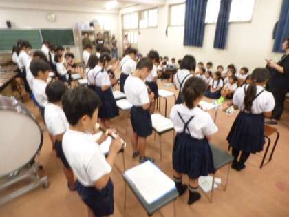 今日の1限目と3限目に、3年と4年の音楽交流会がありました。それぞれの学年が1学期に取り組んできた演奏や合唱をお互いに発表し合う音楽会でした。1限目は、1組同士、3限目は2組同士で発表しました。