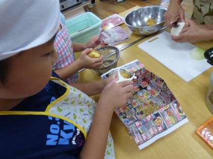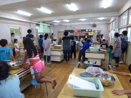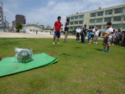 スイカ割りをしました。「右!右!」「もっと前!」などみんなで声を掛け合って、楽しくできました。その後、班に分かれてカレー作りをしました。お友達やおうちの方と協力して、おいしいカレーができあがりました。食後は、スイカをおいしく食べました。