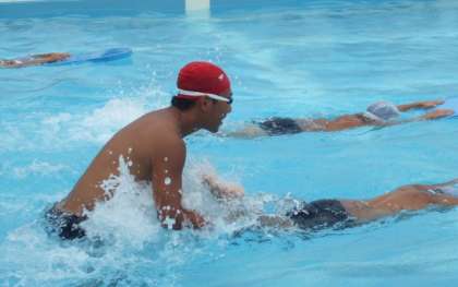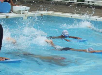 前回習った水中姿勢(ストリームライン)の復習をし、「ボビング」の練習をしました。「ボビング」とは、プールの底を蹴ってジャンプし、顔を水の中と外に出し入れして呼吸をしながら、上下運動をすることです。