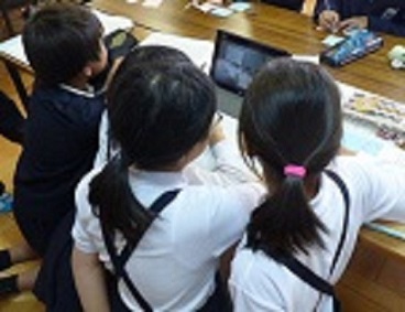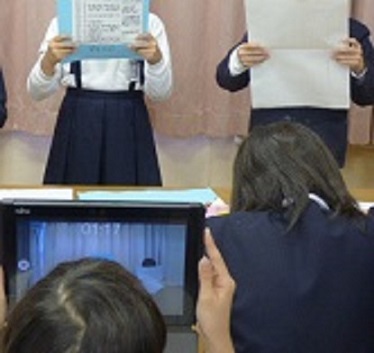 今日は、「和の文化について調べたこと」を発表するための練習の時間でした。子どもたちは、グループごとにタブレットPCを使って発表の様子を撮影し、よかった点や、もっとこうするとよいという点などについて、助言しあいました。