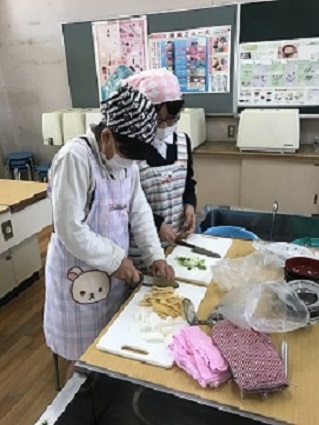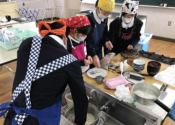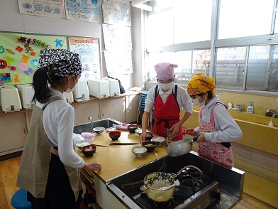 水加減や火加減に気をつけてお米を炊いたり、味噌汁の具を大きさをそろえて切ったり、男女仲良く、班で協力しながら作ることができました。