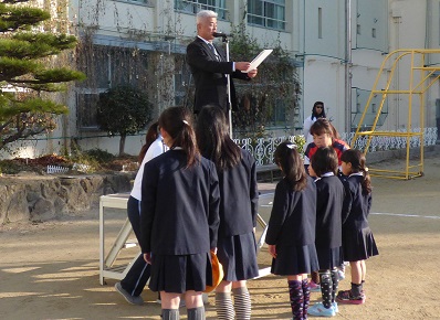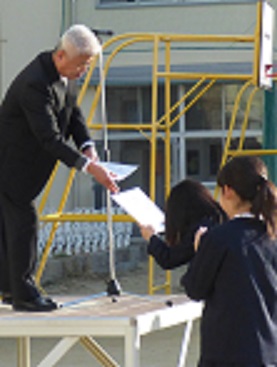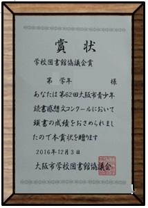 全校朝会で、「大阪市青少年読書感想文コンクール」の表彰式がありました。