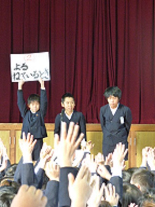 朝は、玄関で、登校してくる子どもたちに「早寝早起き」をよびかけています。