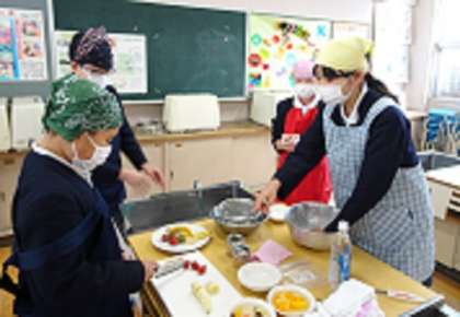 家庭科の「家族とホットタイム」という学習で、フルーツポンチを作りました。男女仲良く、班で協力しながら、作ることができました。