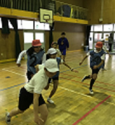今回は、5年生の体育の時間にゲストティーチャーに来ていただき、「バスケットボール」の出前授業を行いました。