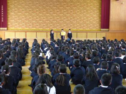 1年生からは、3人の代表が前に出て、楽しかった思い出や今年がんばったこと、また来年がんばりたいことなどを、全校児童に発表しました。