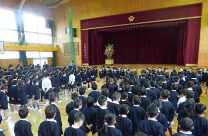 ピカピカの1年生56名、今日は2年生から6年生までのお兄さん・お姉さんたち全員と、初めてのご対面でした。興味津々の1年生は目を輝かせながら入場してきました。