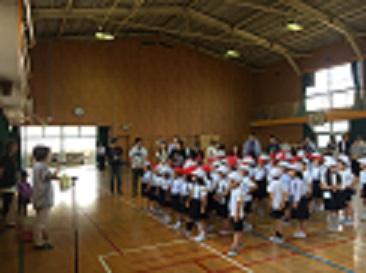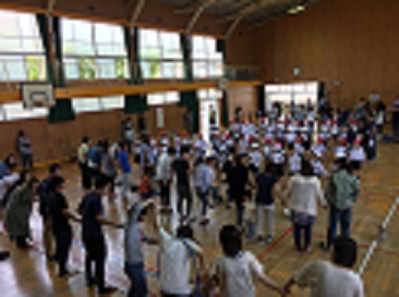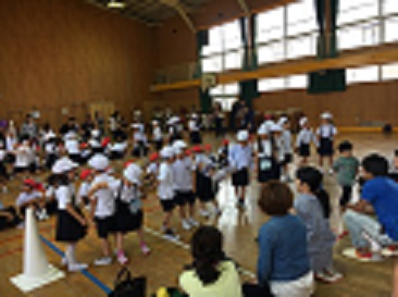 1年生の学級委員さんの進行で、○×クイズやフラフープ送りを親子で楽しみました。