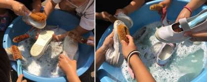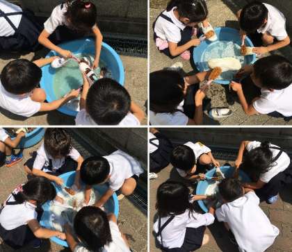 たらいに水をはり、たわしをつかって、力を込めてゴシゴシゴシ。だんだん白くなりました。