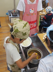その後、班に分かれてカレー作りをしました。お友達やおうちの方と協力して、おいしいカレーができあがりました。食後は、スイカをおいしく食べました。
