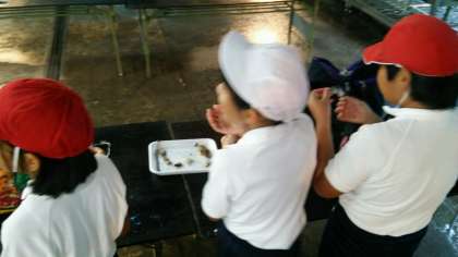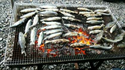 カッパを着て宿舎に戻り、つかんだ魚を焼いてもらいました。