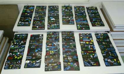 きれいに磨いた焼き板に、思い思いに絵を描きました。
