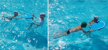 子どもたちは、バディを組んで泳ぎ方の確認をしあったり、カメ・ラッコ・イルカの3つのコースに分かれてクロールの練習をしたりしました。