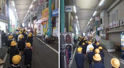 3年生が、十三東本通商店街に出かけました。心配していた雨も降らず、商店街の店の様子を見学したり、店の方にお話を聞いたりすることができました。前に見学したスーパーマーケットとの違いに着目し、学習をさらに深めることができました。