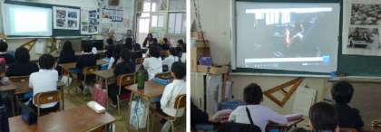 たくさんの資料をもとに昔のお話をうかがったり、七輪と炭をつかって餅焼き体験をしたりしました。