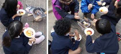 子どもたちからは、「炭で火をおこすのはたいへん。」「けむりがすごい。」「炭で焼いたおもちは、いつも食べるおもちよりおいしい。」「おもちがふくらむところがおもしろかった。」「手にけむりのにおいが残ってる。」など、いろんな声があがっていました。
