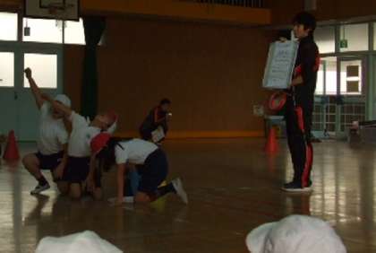 2年生の体育、「へんしんマントで大ぼうけん(表現あそび)」の学習で、授業研究会を行いました。「表現あそび」とは、動物や乗り物などのいろいろな題材の様子や特徴をとらえて、そのものになりきって全身の動きで楽しく表現することをねらいとした学習です。