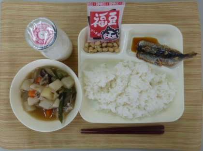 今日の給食は『節分の行事献立』で「ごはん、いわしのしょうがじょうゆがけ、含め煮、いり大豆」でした。
