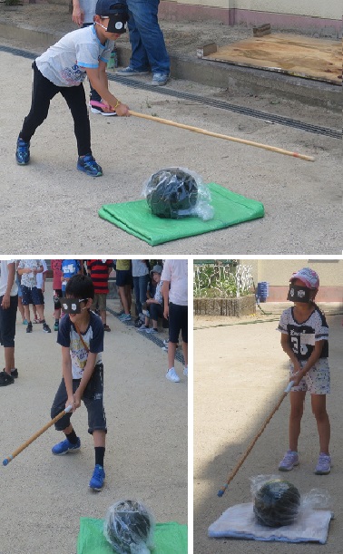 スイカ割りでは、「右!右!」「もっと前!」などみんなで声をかけ合って、楽しくできました。