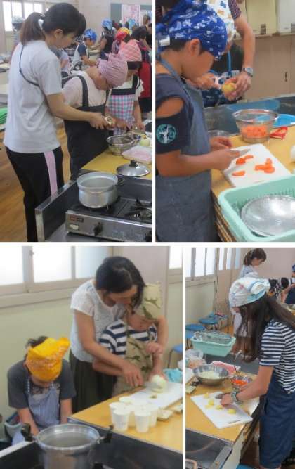その後、班に分かれてカレー作りをしました。お友達やおうちの方と協力して、おいしいカレーができあがりました。食後は、スイカをおいしく食べました。