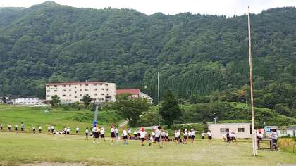 魚つかみを終え、宿舎前の広場に戻って、みんなで遊んでいます。