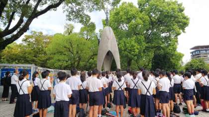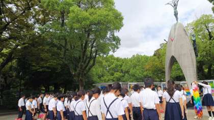 木川小学校のみんなで折った千羽鶴を捧げ、黙祷をした後、平和への祈りを込めてアメージンググレースを合奏しました。